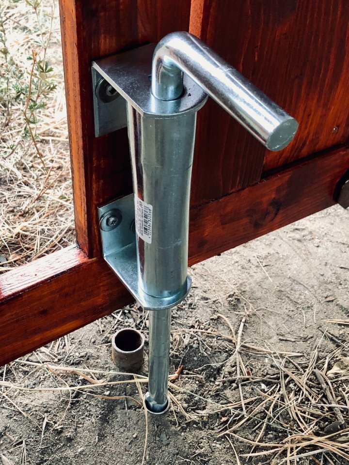 Hinter dem großen Flügel befindet sich dieser Riegel. Den könnt Ihr mit einem Griff durch die Zaunslatten einfach anheben und dann behutsam das Tor öffnen. Ihr werdet sehen, dass sich dort zwei Löcher befinden, in die der Bolzen des Riegels reinpasst. Wenn Ihr den Riegel wieder einsetzt, nehmt bitte das kleinere weiße Kunststoffloch (wie im Foto). Das ist momentan noch ein Interim und wird demnächst durch ein anständiges Metallrohr ersetzt.